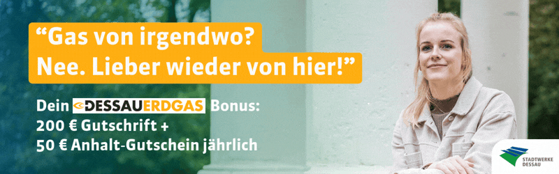 * Die Aktion „Erdgas lieber von hier“ gilt bis zum 17.04.2026 beim Abschluss des Sondervertrags DessauErdgas Heimatliebe+ im Privatkundensegment mit einer Mindestvertragslaufzeit von 12 Monaten. Teilnahmeberechtigt sind Neukund:innen, die in den letzten sechs Monaten keinen Vertrag mit der Gasversorgung Dessau GmbH hatten. Ausgeschlossen sind Personen mit offenen oder ausgebuchten Forderungen aus früheren oder laufenden Verträgen mit der Gasversorgung Dessau GmbH oder verbundenen Unternehmen. Die Aktion ist nicht mit anderen Angeboten kombinierbar. Der Bonus in Höhe von 200 € wird als Verrechnungsgutschrift mit der ersten Jahresrechnung verrechnet. Der Tarif DessauErdgas Heimatliebe+ beinhaltet zusätzlich einen jährlichen 50‑€‑Anhalt‑Gutschein für das laufende Vertragsjahr. Alle Bedingungen sind im aktuellen Preisblatt nachzulesen.