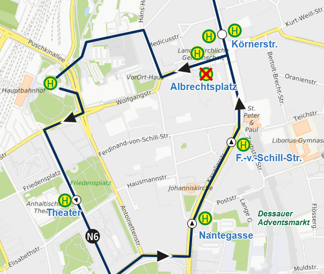 Im genannten Zeitraum entfällt die Bedienung der Haltestelle „Albrechtsplatz“ (Fahrtrichtung Roßlau). Ersatzhalt ist hier die Haltestelle „Körnerstraße“.